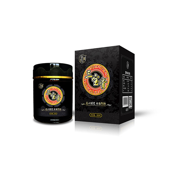 產品描述:【品名】三寶膏【類別】植物飲料【配料】蜂蜜、黑芝麻、黑豆、黑米、黃精、枸杞子、桑椹、百合、大棗、茯苓、蓮子、益智仁、核桃仁、杜仲雄花、人參(人工種植)、純化水【食用限量】杜仲雄花食用限量:6克/天;人參(人工種植)食用限量:3克/天。【凈含量】260