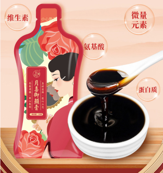 產品描述:【品名】月喜御顏膏【類別】植物飲料【配料】飲用水、麥芽糖漿、蜂蜜、紅棗、桑椹、人參、阿膠、山藥、桔紅、香瓣紅玫瑰、枸杞、甘草、龍眼肉、茯苓、白芷、沙棘、百合、桃仁、葛根【凈含量】20克(20克/袋5袋)【食用方法】開袋即飲,每天1-3袋,每一次1袋,直接口服或兌200毫升開水沖調飲用食用限量:本品每100g加入人參(人工種植)2.4g,人參食用量3g/天【執行標準】GB/T31326【食品生產許可